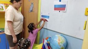 Далее в игровой форме ознакомили детей с цветами флага, составили на доске из линий разных цветов флаг России, закрепили полученные знания с помощью физкультминутки.
